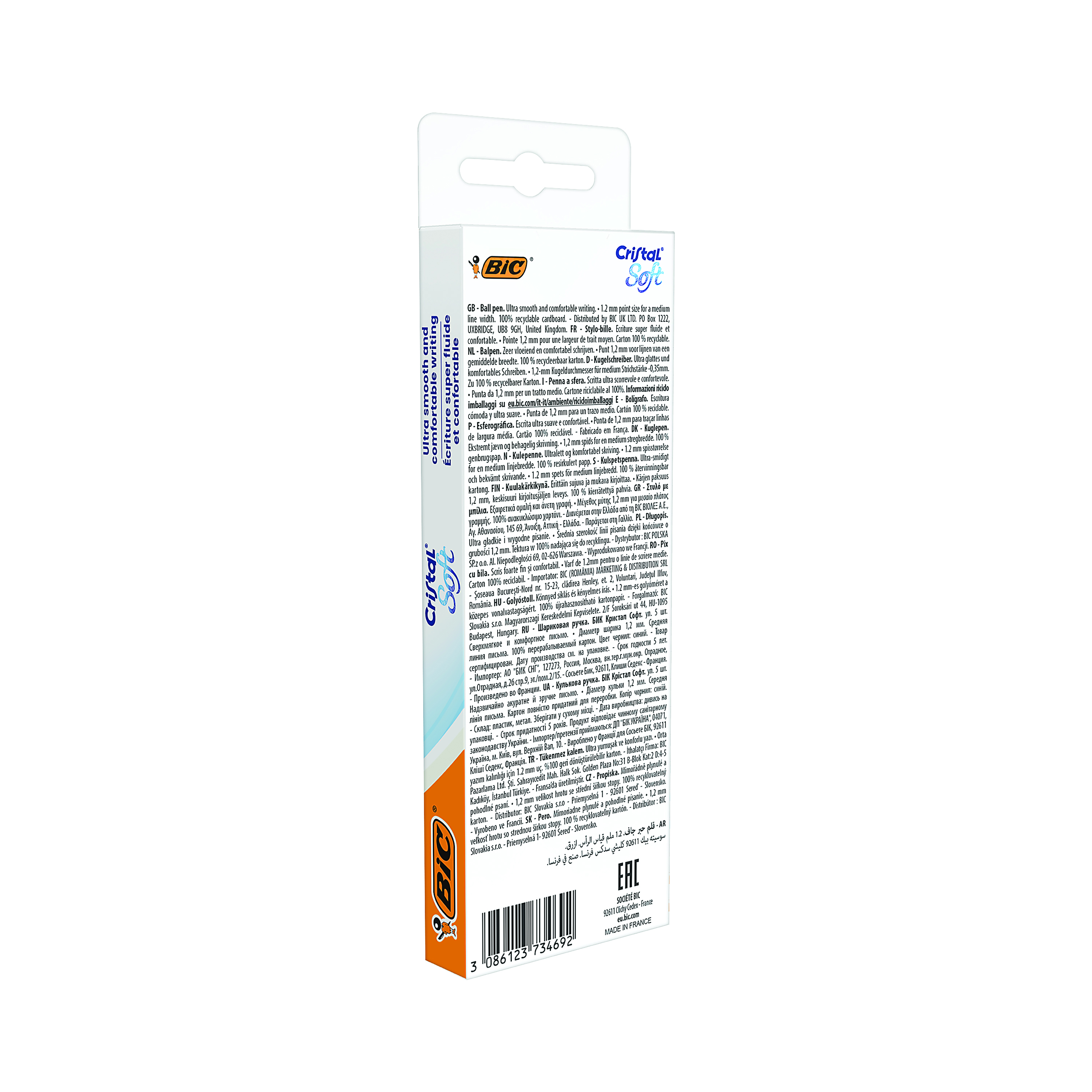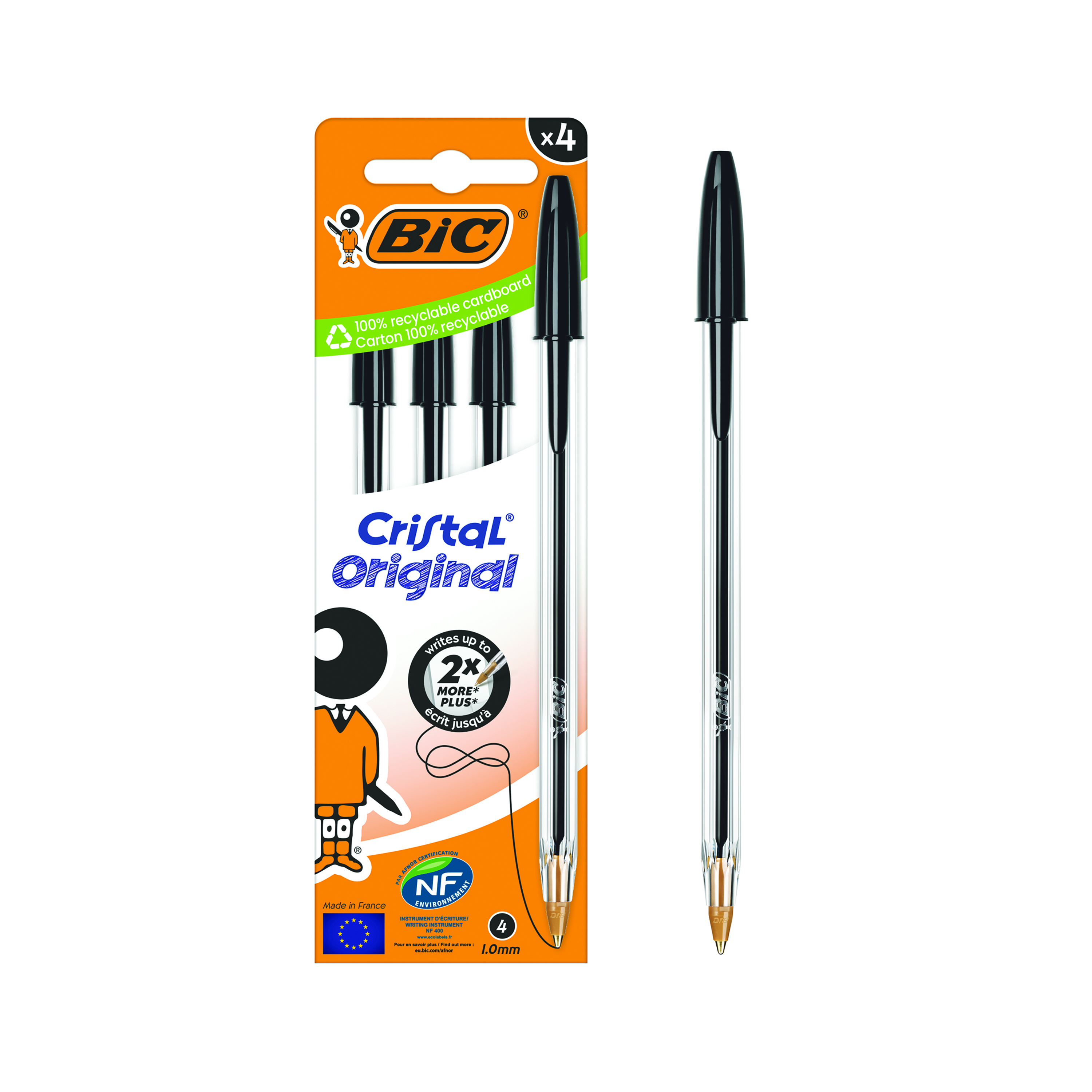 These Bic Cristal Ballpoint Pens feature a durable tungsten carbide ball mechanism and smooth, instant drying ink for reliable, everyday use. The medium 1.0mm tip produces a thin 0.32mm line. The hexagonal barrel includes a black cap and end plug that matches the ink colour for easy identification. This pack contains 4 black pens in a recyclable cardboard box.