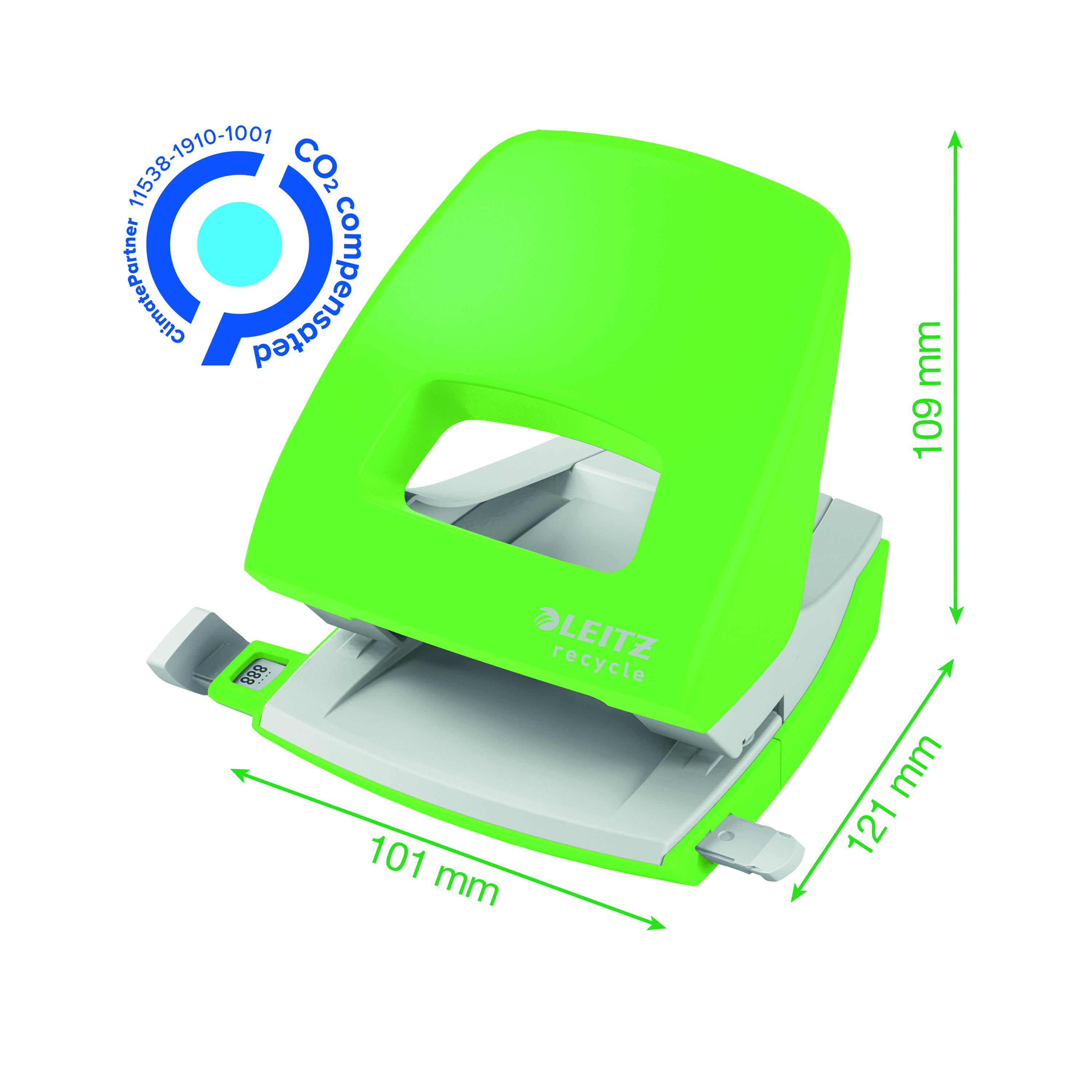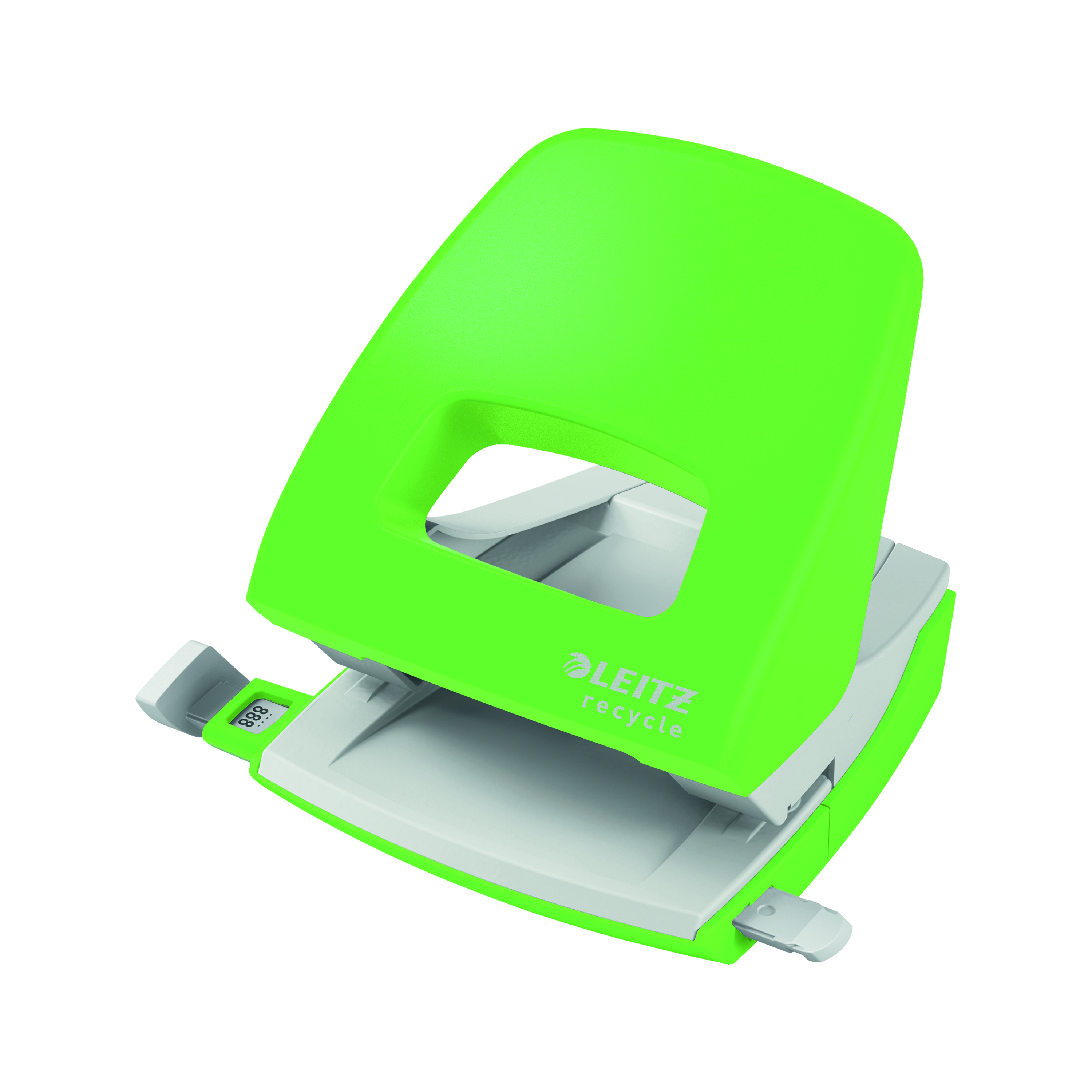 Eye-catching, premium hole punch made with post consumer recycled plastic for every day use. 100% recyclable as it can be completely dismantled in the different material types. Patented easy slide-in grip zone and ultra sharp stamps reduce punching effort. This robust and reliable paper punch perfectly complements other products from the Leitz Recycle range and is made to last. Modern and contemporary green stationery that will look great at home and in the office. With the eco friendly Recycle range from Leitz you can both improve your office environment – and the environment of our planet.