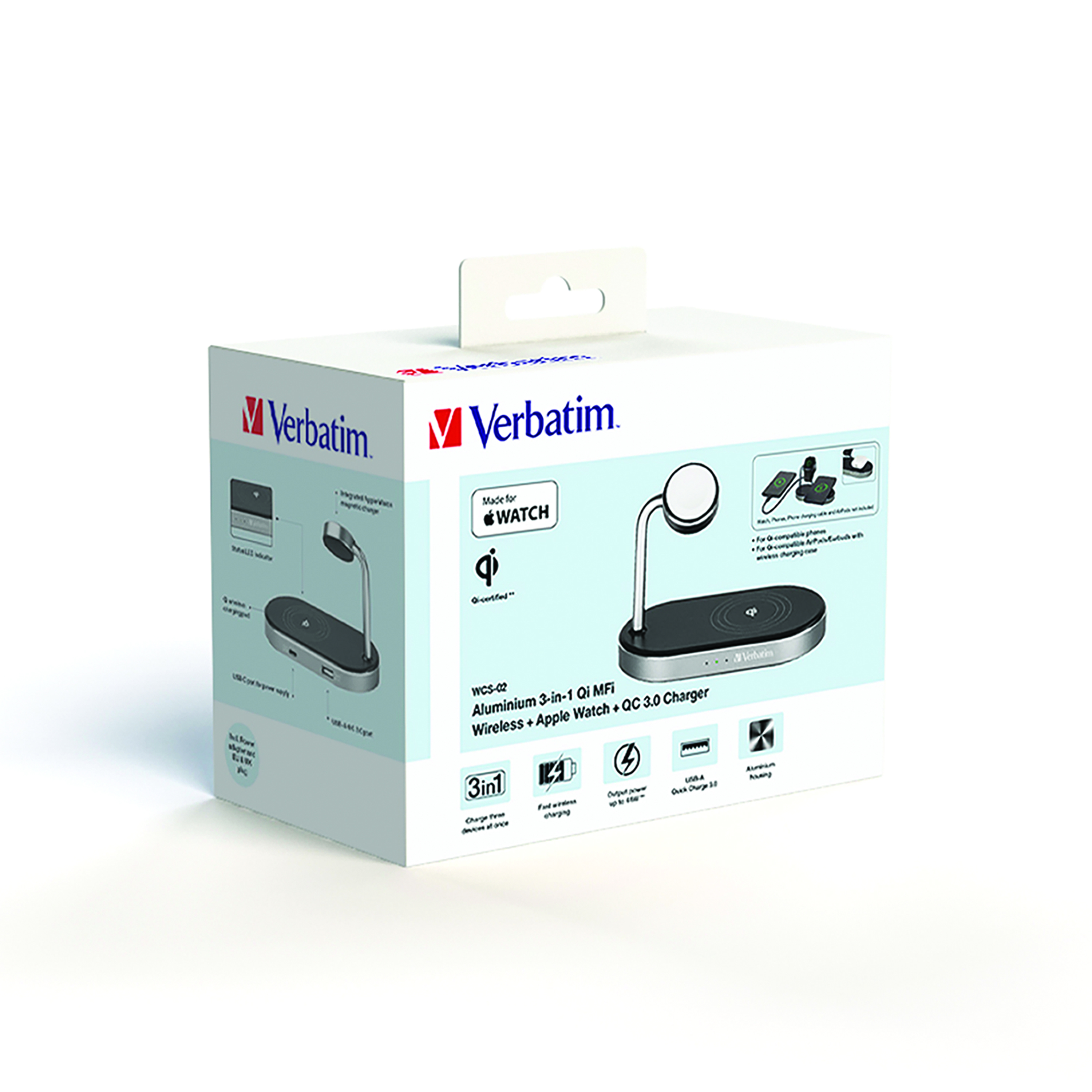 Verbatim WCS-02 Aluminium 3-in-1 Qi MFi Wireless + Apple Watch + QC 3.0 Charging Station 49556