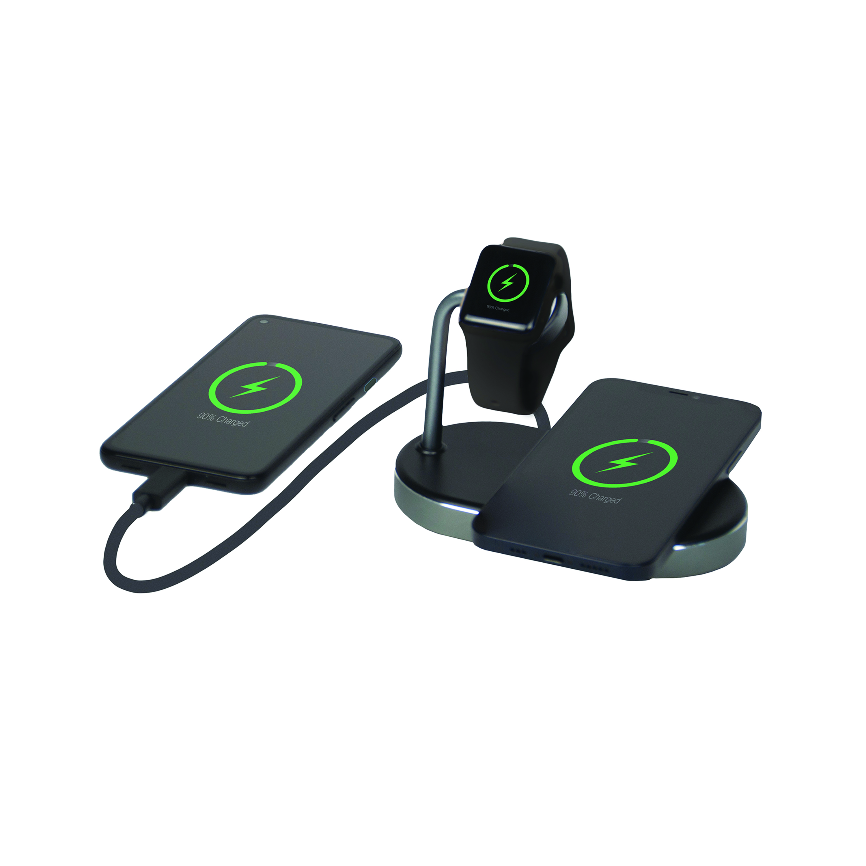 Wirelessly charge your Apple Watch, iPhone (8 or later) or other Qi-certified wireless charging enabled device, and a third device by cable via the Quick Charge 3.0 USB-A port. The charging station is engineered to charge devices as fast as possible, although the actual charging speed is dependent on the device. Apple watches charge at 5W while other devices can charge at up to 15W. With over-current, over voltage protection, the charger can prevent over-charging your devices' battery. Get all your devices charged at the same time with the Verbatim 3-in-1 charging station.