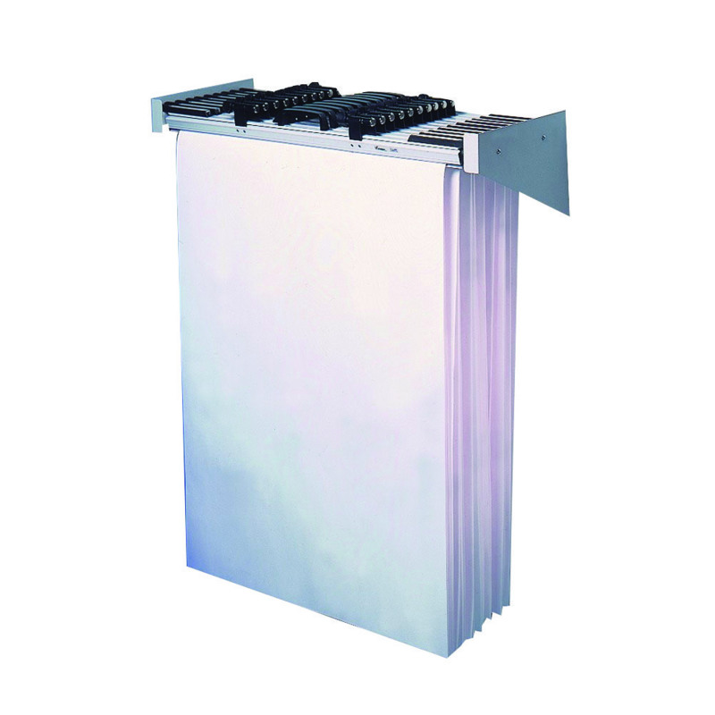 Install a Vistaplan Grey A0 Plan Wall Carrier for compact storage for up to 500 large format documents. It can hold up to 10 Vistaplan Plan Hangers for organising and filing plans, drafts and other drawings. The compact design affixes to your wall, allowing easy access to all essential artwork. It is ideal for permanent filing of important documents in art departments or offices where space is at a premium.